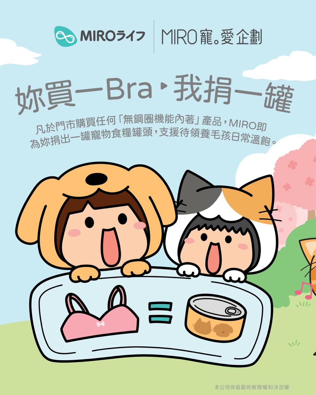 MIRO| 寵。愛 企劃【1 BRA 1 罐】 即日起至 31/5,預約到門市試身並選購任何無鋼圈機能內著產品。🛍️妳買 1 件,MIRO 就捐 1 罐寵物食糧🐱🐶。 所有罐頭將捐贈予「ARP 有尾無尾拯救隊」(慈善牌照號碼 : 91 / 20347),支援正在被遺棄及等待領養的毛孩。 目前每月約有 25 隻被救援的毛孩,暫住義工家庭,等待一個真正的家。而妳的參與,可以讓牠們至少不再為下一餐擔心。 🎁慈善紀念品限量換領 MIRO × 本地人氣插畫家「路邊攤」聯乘設計限量紀念品,包括:可愛襟章、寵物裹覆布、防水寵物野餐墊。 (數量有限,送完即止) 👉 立即WhatsApp 預約無限極廣場門市試身https://wa.link/swnivz 如有任何爭議,MIRO將保留最終決定權。